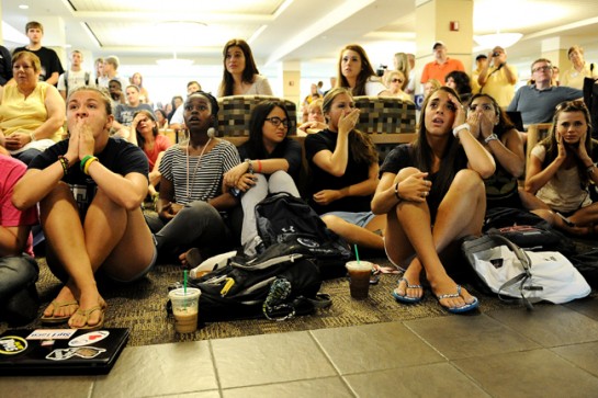 The ESPN telecast showed student reaction (photo) on a split screen as NCAA President Mark Emmert ticked off one harsh penalty after another against Penn State’s football team. Clearly these horrified Penn State students were being punished for the sins of the formerly sainted coach, the university president, and other senior members of the administration. Their future autumn Saturdays, their social lives, and their pride in their university were being stripped from them.